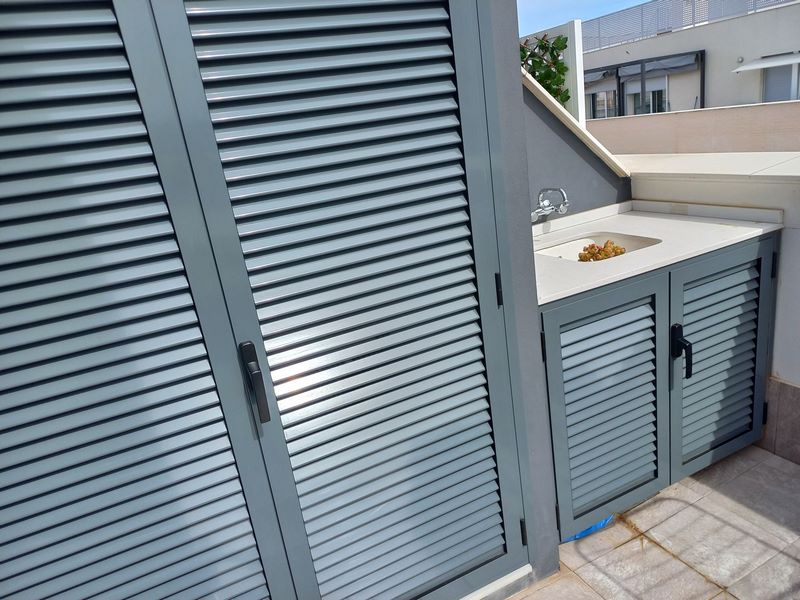Para aprovechar su espacio al máximo, antes los inconvenientes que nos deparan los armarios de resina, contamos con los armarios de aluminio. Las prestaciones que nos aporta este material para exteriores no tiene comparación con ningún otro.